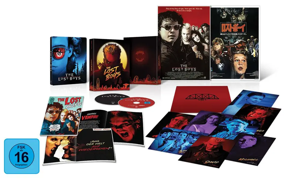 Die Ultimate Collector’s Edition zu The Lost Boys beinhaltet: Ein Steelbook mit Pappschuber, Artcards, das (japanische) Kinoposter und ein Booklet.